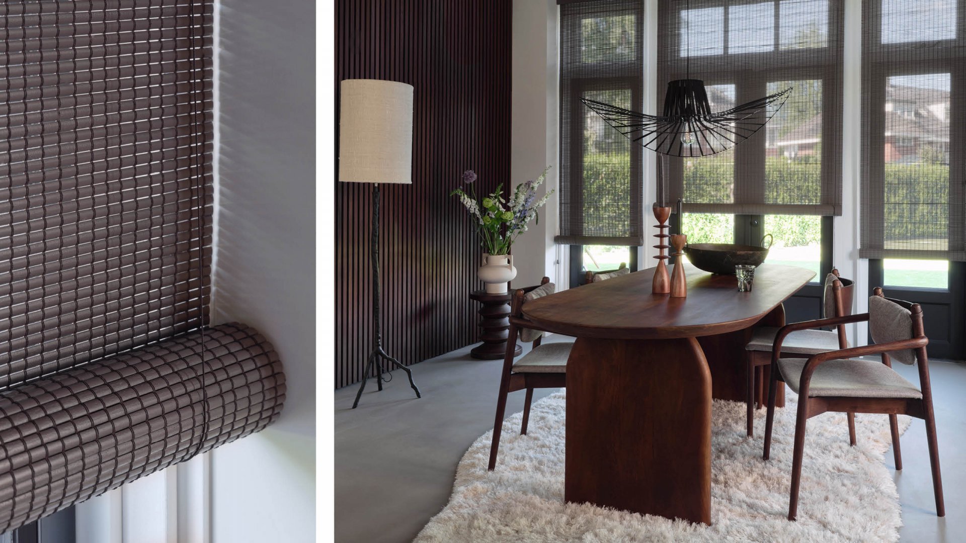 Laat ’s ochtends het zachte zonlicht rustig je eetkamer binnenstromen terwijl jij geniet van een ontbijtje met versgebakken broodjes. En ’s avonds? Tover de ruimte om tot een knusse, warme plek voor een diner met vrienden of familie. Met een geweven houten roll-up bepaal je zelf hoe veel licht er binnenkomt, precies zoals jij het wil.
